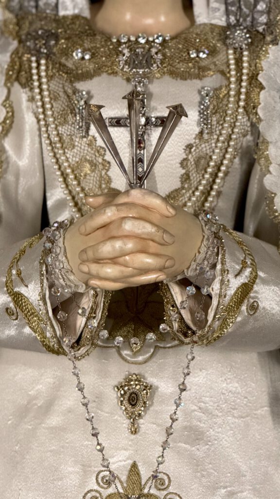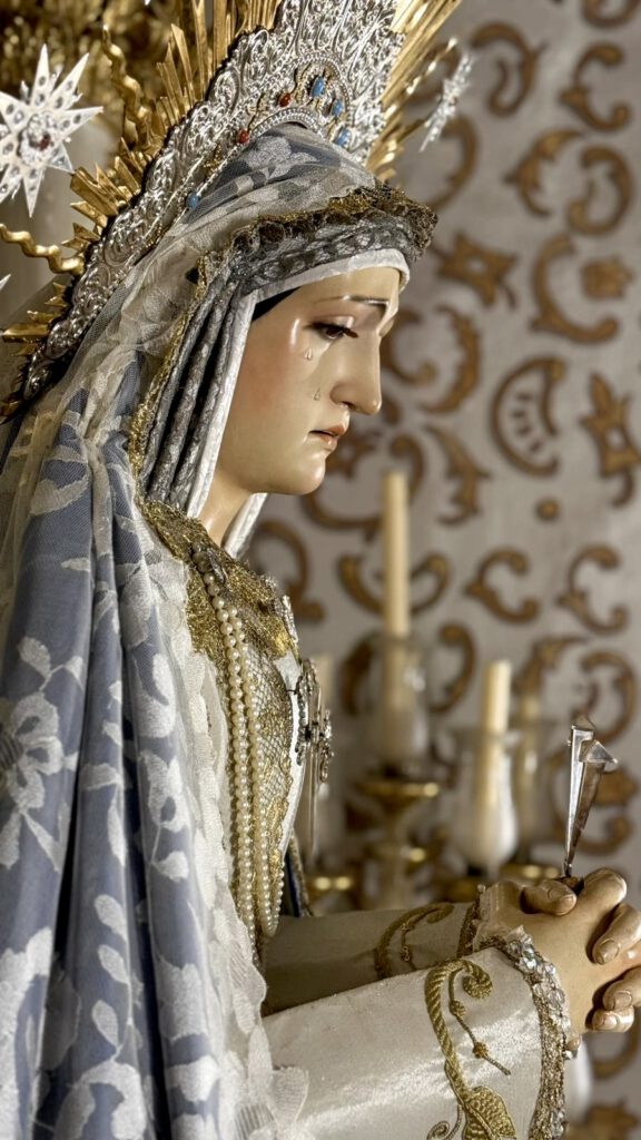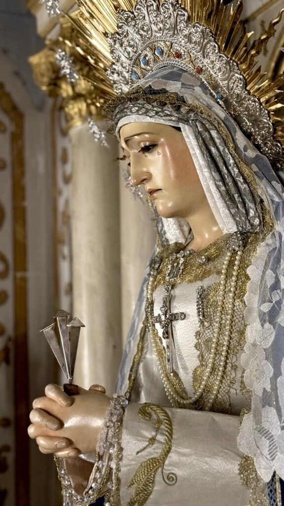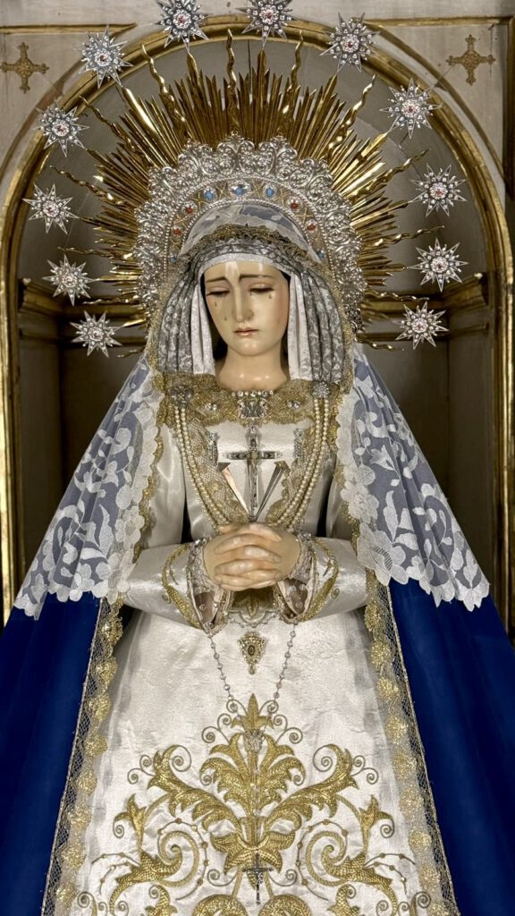 Así, la Santísima Virgen de los Dolores, nuestra Madre y Señora, amanece en su parroquia de San Pedro y San Pablo ataviada bajo manto de terciopelo azul y saya bordada en oro sobre tisú de plata por su vestidor D. Francisco Garví.